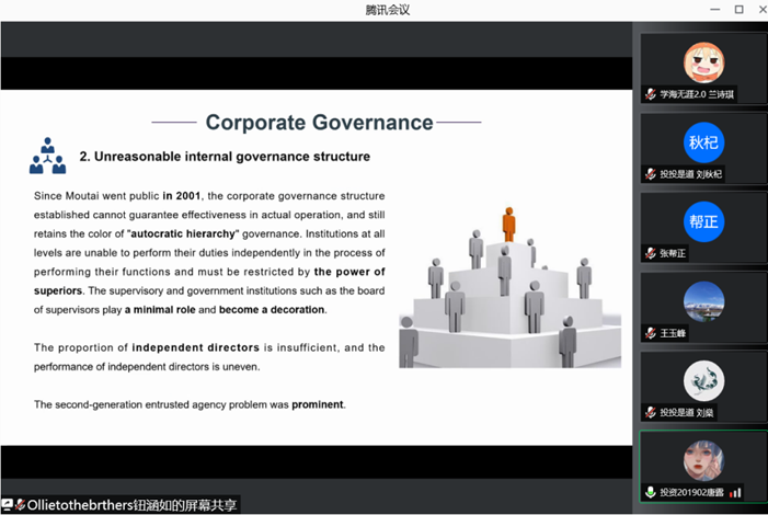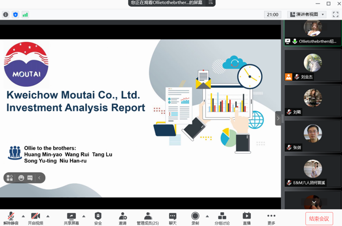 本次选拔赛包含书面评审和线上答辩两个环节,参赛学生覆盖金融学、投资学、财务管理、资产评估、市场营销和地理信息科学等多个专业。在进行答辩前期准备时,各队伍团结合作、精心准备,共同完成了高质量的汇报PPT。正式答辩环节,Ollie to the brothers、E&M六人团、投投是道、学海无涯2.0等队伍分别用全英文进行了相关的PPT汇报,并由评委老师分别进行提问、指导。比赛过程中,参赛团队表现优秀,展示全面,充分展现了太阳集团学子的专业实力。最终学海无涯2.0团队,凭借流利的英文陈述、严谨的分析逻辑、扎实的投资专业知识获得校内选拔赛一等奖。此外,E&M六人团团队获得二等奖、Ollie to the brothers与投投是道团队获得三等奖。