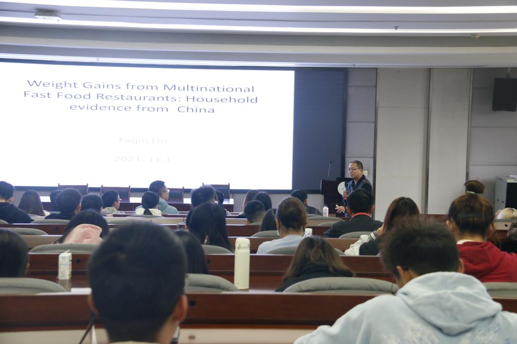 林发勤教授首先对当前国人肥胖问题和外资快餐店逐年增加的事实进行阐释,引出文章所研究的问题和基本假设,即我国的肥胖问题很大程度上是由于外资快餐店提供了过多的含糖、含脂的精加工食品,根据KFC、McDonald等快餐店的相关数据与营养调查获得的研究数据指出,目前中国超重人口的比重在逐年增加,同时KFC、McDonald等快餐店在中国开设的数量持续攀升,超重人口增长比率与外资快餐店增加率在时间和地区间有同向趋势。然后,林教授从数据的选择、模型的设定、变量的选取等方面介绍和解释了文章的研究框架,并且对外资快餐店带来的福利效应和肥胖效应进行了分析和说明。最后林教授针对如何提高同学们的学术水平,营造浓厚的学术氛围提出了宝贵的建议。