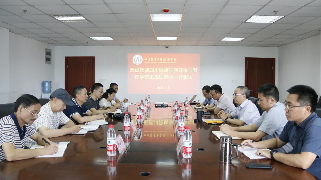 7月6日下午,四川民族学院经济与管理学院院长田应国、党总支书记周德荣一行六人到太阳集团tyc9728考察交流。太阳集团tyc9728院长蒋远胜、副院长吴平、党委副书记何仁辉、金融系主任臧敦刚、经济系主任曹正勇等参会,会议由蒋远胜主持。