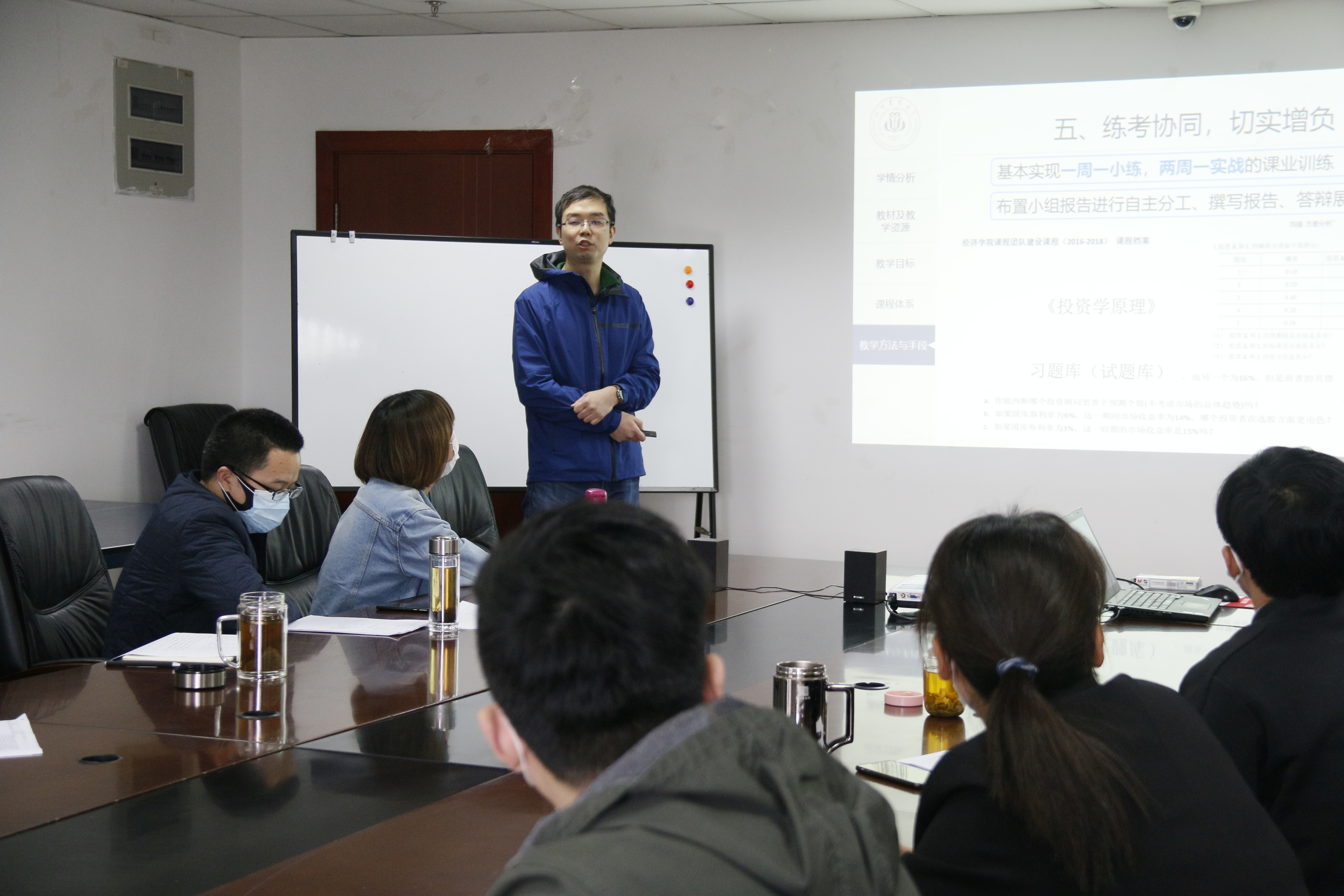 来自金融、投资、经济和国贸系的9位参评教师按抽签顺序依次进行教学示范,包括8分钟的课程说课和15分钟的教学展示。老师们准备充分,讲课结构清晰、内容详实、课件制作精美、辅助工具丰富,充分展现了自身的专业素养和教学技能,获得评审的一致好评和认可。张剑老师的“投资决策法则”以两个生活中常见的投融资决策案例作为开场,深入浅出的讲解了“内部收益率法则(IRR)”的运用及代码实现,最终通过代码解析回答了开场案例的方案选择问题,课堂氛围生动风趣,图文并茂易于理解。臧敦刚老师由当前疫情下微博热搜关键词引入“存款准备金政策”,详细阐述了该政策的传导机制、优缺点以及实际操作,教学内容丰富清晰。杨浩老师从“欲望和效用”、“总效用和边际效用递减规律”、“效用最大化”三个方面对“效用理论”进行分析,并拿出了预先准备好的苹果、梨子和天平,通过简单易懂的操作,生动形象的展示了如何实现效用最大化。