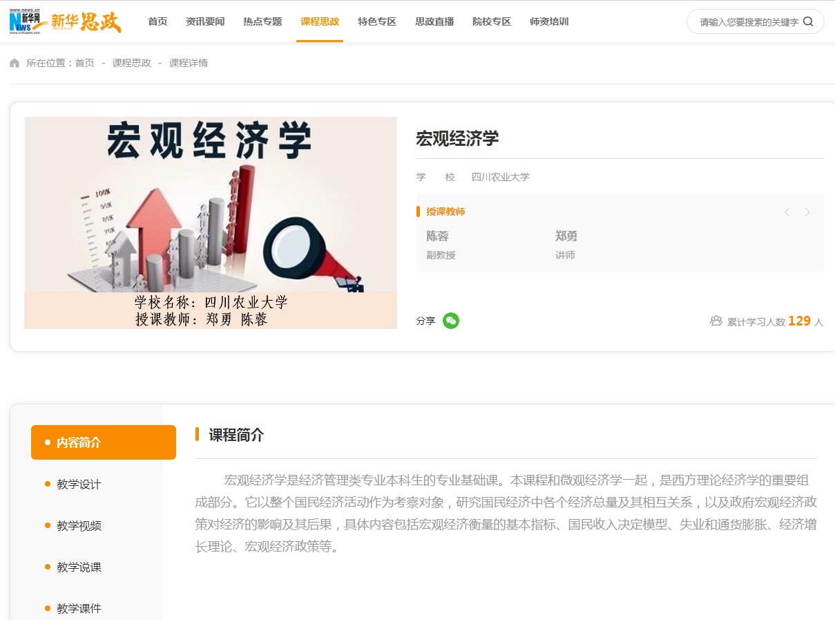 近日,太阳集团《宏观经济学》课程在“新华思政”——全国高校课程思政教学资源服务平台上线,面向全社会开放共享,截至目前,已有129人次观看学习。