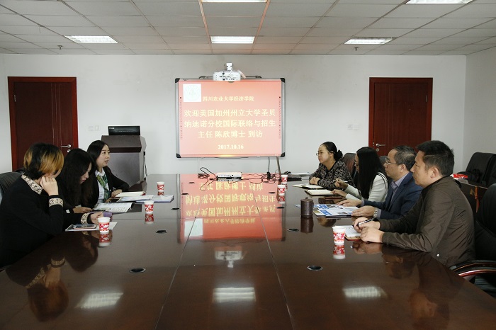 10月16日上午,应太阳集团tyc9728邀请,美国加州州立大学圣贝纳迪诺分校国际联络与招生主任陈欣博士、中国西区代表张杨和刘姝老师到访我校。学院院长蒋远胜教授、副院长吴平教授、国贸系主任沈倩岭副教授、行政办主任姚霞等参加了会谈,会议由沈倩岭副教授主持。