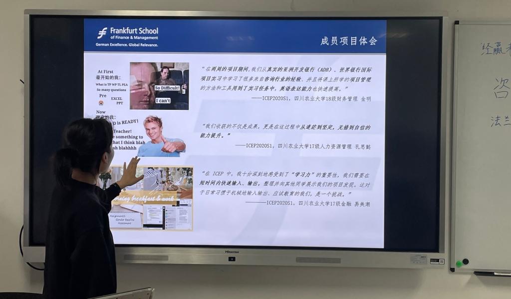 德国法兰克福财经管理大学何佳教授首先介绍了ICEP国际竞争力提升项目整体情况,项目围绕金融经济学概论、发展金融、创新与战略管理、项目管理、结构式问题解决方法等内容,通过理论学习和实习实践,帮助学生拓展全球视野、提高学习能力与工作技能、提升英语水平、培养卓越领导力。参与过该项目的学姐与同学们分享了项目往期的精彩瞬间以及成员的项目体会,幽默生动的风格令同学们捧腹,也惊讶于该项目在短时间内给同学们带来的收获。