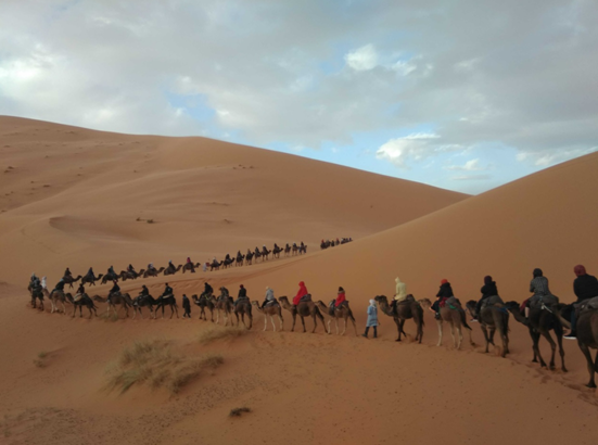 异国风土人情激起我浓厚的兴趣,于是又南下去北非摩洛哥,这次想“寻觅中华”,探索阿拉伯文明和中华文明的异同。真正的感悟是骑着骆驼,跟大队伍进了撒哈拉才产生:忽然发现两种文明更显共性,两者最大的相同点在于,无论是两千年前张骞骆驼队走出的丝绸之路,还是现在摩洛哥小哥牵骆驼的沙漠团,这两种文明都是由最平凡、最普通的人,牵着骆驼或骑着马,一步一个沙印,年复一年走出来的。