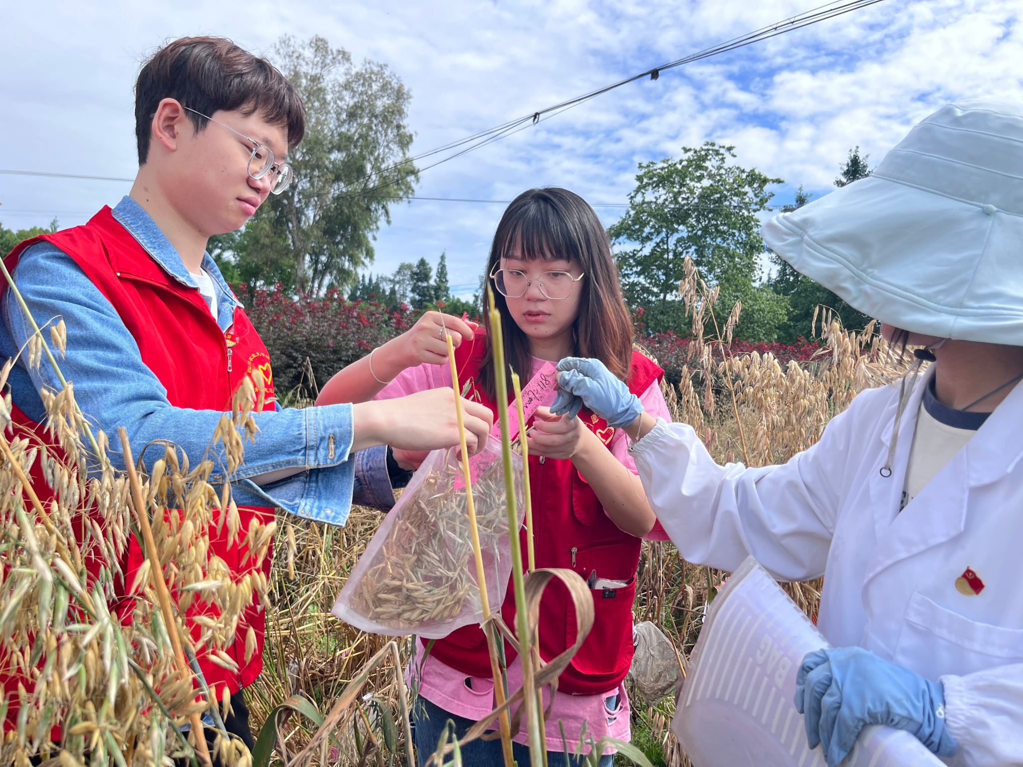 活动中,两支部党员参观了温江区高山村燕麦试验田,现场学习了燕麦关键育种技术——带芒标记性状集成优选技术的研究成果,了解到了我国裸燕麦的起源进化及当前燕麦与农业新质生产力的重要联系,并结合各自专业背景与科研经历,立足当前我国农业发展现状,聚焦新质生产力发展、粮食安全以及如何助力农业新质生产力发展等热点问题进行了思想碰撞和深入探讨。