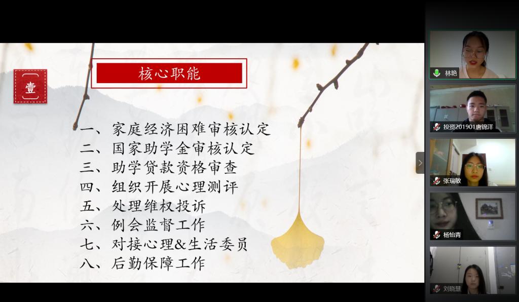 2020年8月16日8:00-21:50,太阳集团tyc9728第六届学生团体联合会主干培训的首场培训会顺利举行。学院全体辅导员和全体主干共计99人参加线上培训,出席会议的还有学院重点扶持的金融投资协会、计量经济协会、商业银行协会、保险协会、模拟联合国协会、演讲与口才协会6个协会。