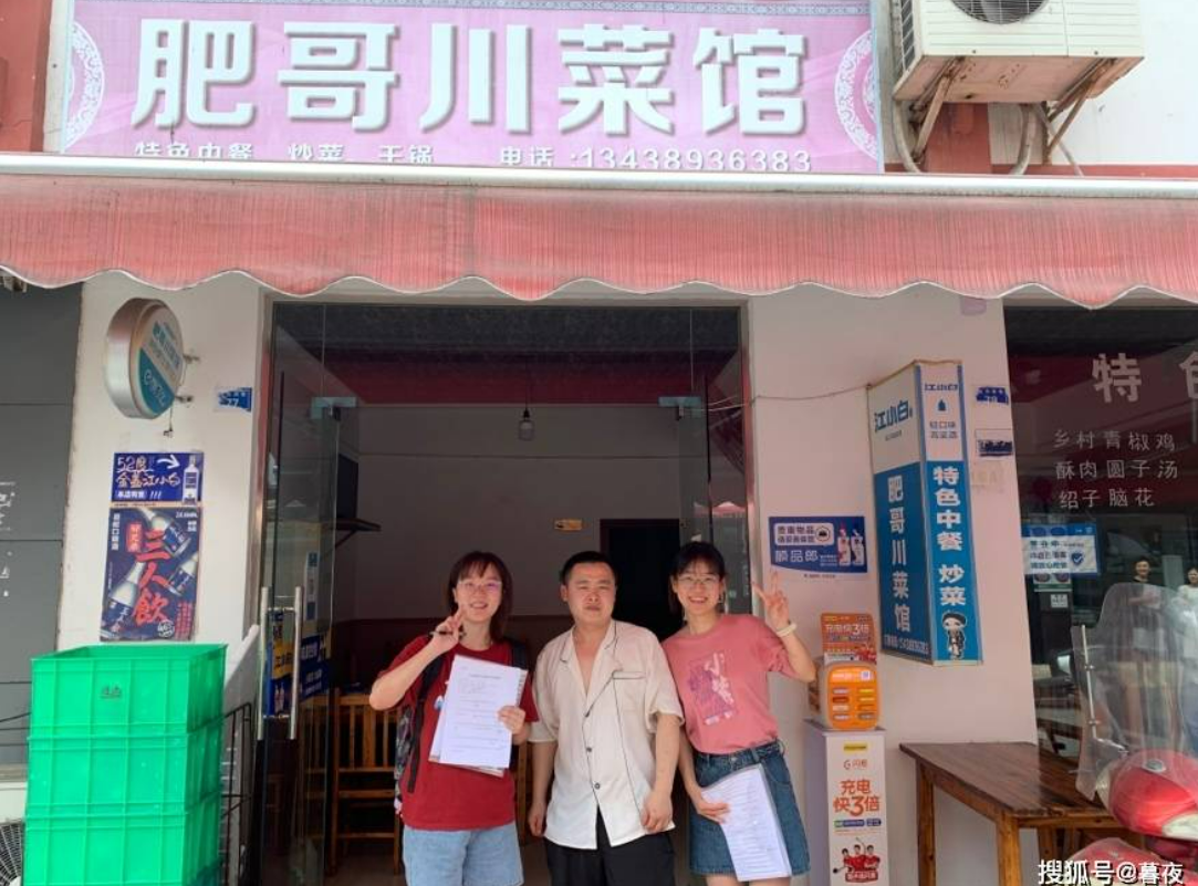 图为“外卖绿色联盟”成员在成都市温江区公平街道惠民路对商家周记老麻进行实地调研,问卷访谈
