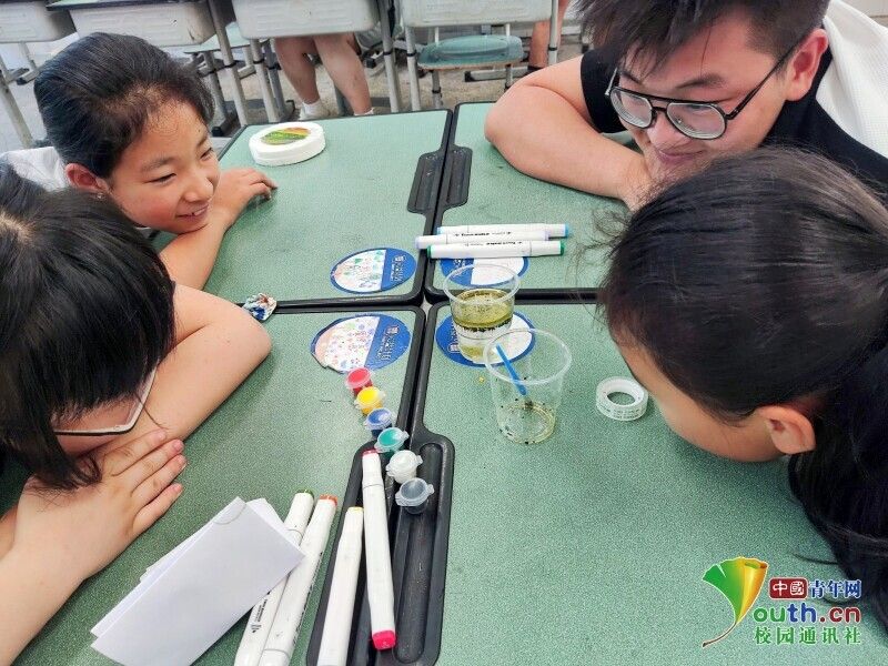 图为志愿者和小朋友一起观察科学小实验。中国青年网通讯员 黄欣 摄