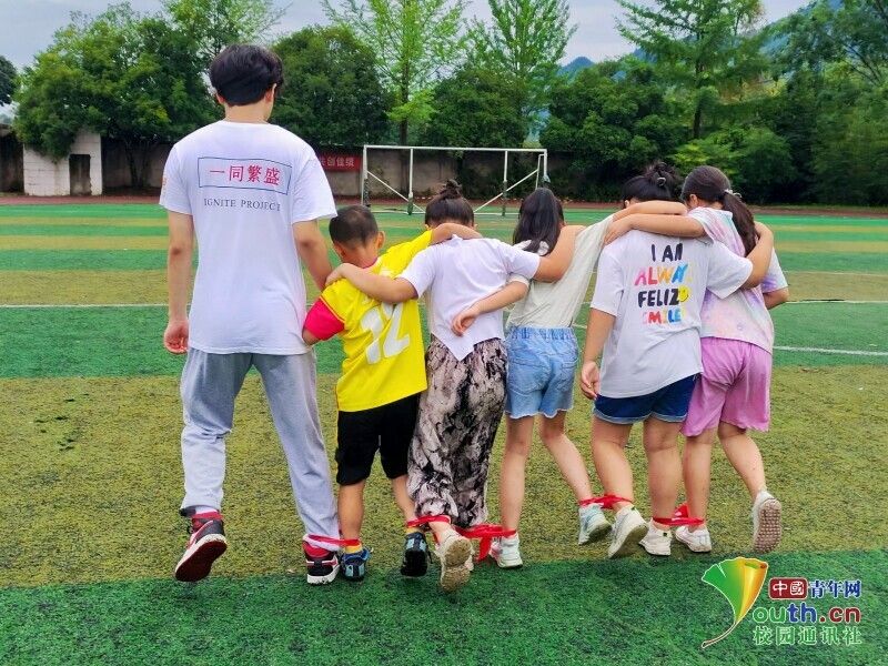 图为志愿者与小朋友进行“两人三足”游戏。中国青年网通讯员 兰心怡 摄