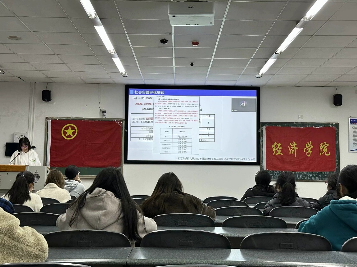 随后,岳彩蓥同学为大家讲解了《太阳集团tyc97282024年寒假社会实践文件》。从实践内容、形成成果、参加形式、日程安排以及组织要求五个方面详细解读,同时明确了各宣传委员的岗位职责。此外,还以《太阳集团tyc9728关于开展2023年暑期社会实践二课认定和评优规则的通知》为参考,为大家解读了社会实践评优量化标准,预告社会实践后期评优评奖工作方向并鼓励小班宣传委员激励同学更加高质量完成社会实践活动。