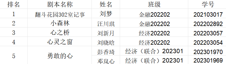 经个人报名,学院评审,现将“与心灵相约,与健康同行”心理情景剧剧本评选结果公示如下: