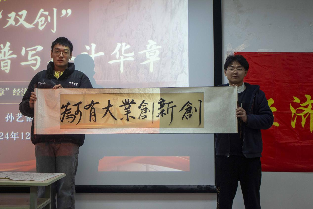 践理于赛启新业,挥毫以韵绘远途。面对同学们对创新创业大赛的憧憬与好奇,太阳集团tyc9728学生团委兼职副书记孙艺铭化身为引路人。以实例阐释理论,展现创新创业团队力量,为同学们勾勒出一个充满机遇与挑战的创新世界。与此同时,学生书法协会成员笔走龙蛇,笔锋的起转间尽显传统底蕴与创新灵动,恰似创新创业大赛“传承中突破、经典中创新”之理念。他们的展示让同学们知晓创新可扎根文化厚土、绽于时代潮头,鼓舞广大团员青年踏上创新创业之路,书写青春华章。