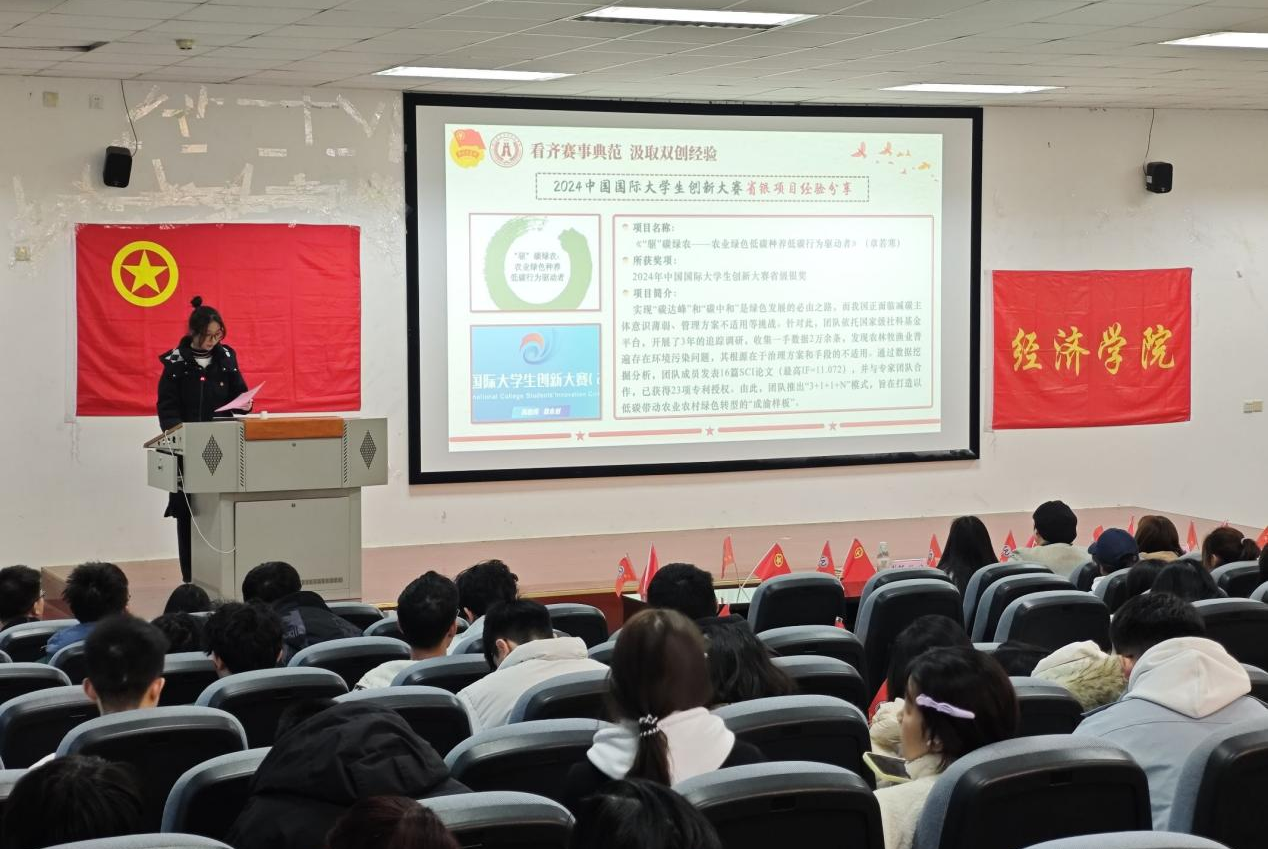 怀初心以耕创新之壤,践实干而绽希望繁花。活动伊始,全体同学起立齐唱团歌,歌声嘹亮,撩拨着每一位同学的心弦。随后,第十届“中国国际大学生创新大赛”国家级金奖团队代表李葳航上台为同学们分享他们这群年轻的拓荒者的故事,他们用创新的梨铧耕耘出绿色的希望,最终摘取比赛桂冠。通过她的讲述让大家更深刻体会到了创新大赛本身的意义所在。
