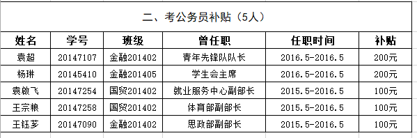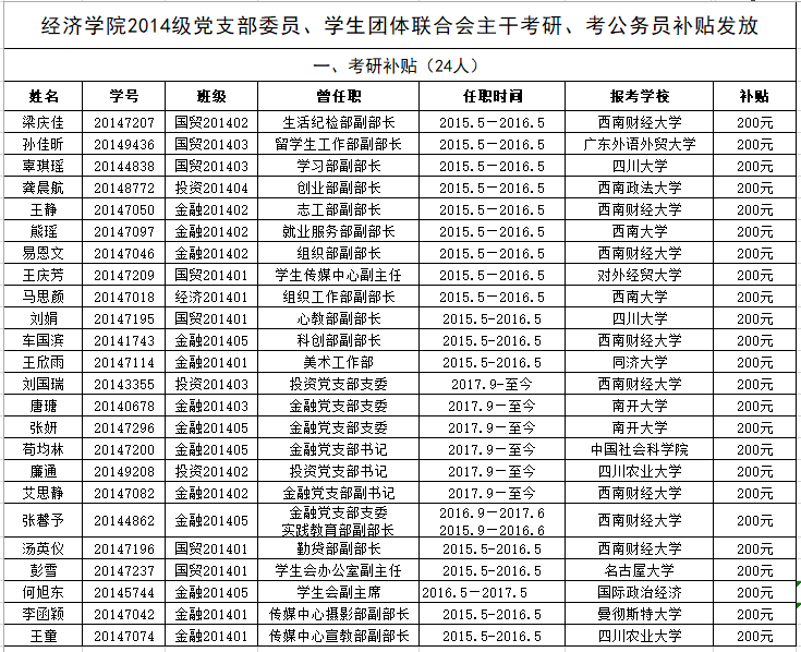 太阳集团tyc9728团委拟对2014级现任或曾任党支部委员、学生团体联合会主干(需任满一届)考研、考公务员补贴,预算1万元,超过则打折发放。补贴发放规则如下: