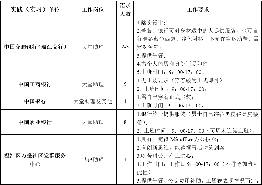 学院团委为培养学生的实践动手能力,促进学生在实践中运用知识,提升自身素质,同时利用寒假较长时间,给更多有意愿参加实践(实习)的同学提供机会,近期将开展银行实践(实习、挂职)活动。具体事宜通知如下: