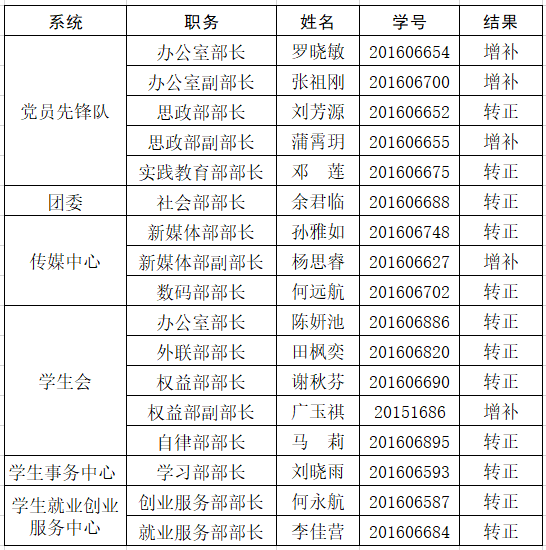 根据《太阳集团tyc9728关于加强学生干部队伍建设的实施办法》(院团字[2016]11号)文件精神,经民主测评、答辩、团委研究决定,确定太阳集团tyc9728第三届学生团体联合会中期增补、转正人员,现将名单公示如下: