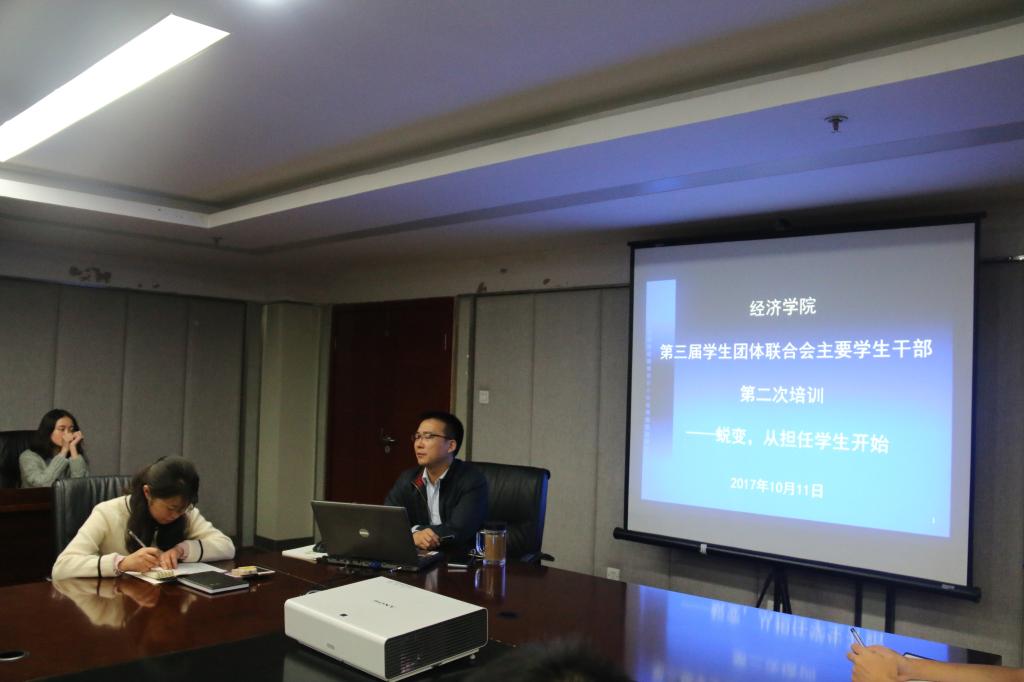 10月11日晚,太阳集团tyc9728在1-408会议室召开2017-2018-1学期第三次学生团体联合会主干培训会,学院党委副书记何仁辉、学院党委办主任蔡丹出席了此次会议,学院学生团体联合会主席团及各骨干到场参加。