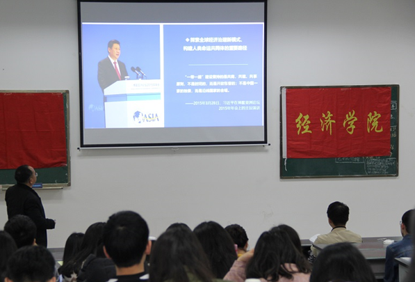 “2013年9月,习近平总书记提出陆上丝绸之路,10月份又提出了海上丝绸之路。“李阳明副教授以习近平总书记讲话为切入点,详细地阐述了‘一带一路’的历史来源与现代发展。“当今中国的发展还存在问题,受着欧美等国的牵制,而‘一带一路’正是中国摆脱这种困境的必须之路,就像给大鹏插上两只翅膀,使之飞得更高更远。”他强调,广大团员青年要深刻了解“一带一路”,尤其是国贸专业的同学要努力成为“一带一路”建设需要的人才,争当合格的共青团员,报效祖国。