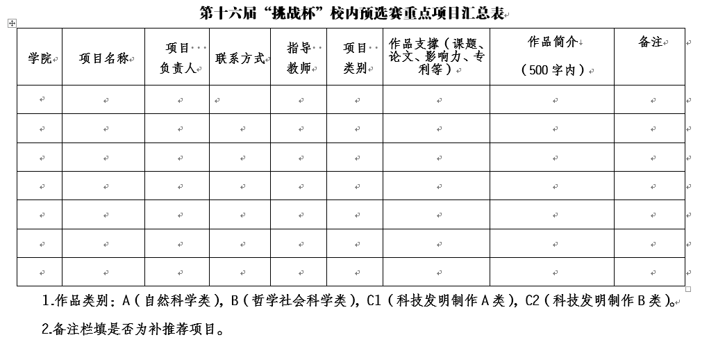 1.团队按项目进展情况填写《第十六届“挑战杯”校内预选赛重点项目汇总表》(附件1)。