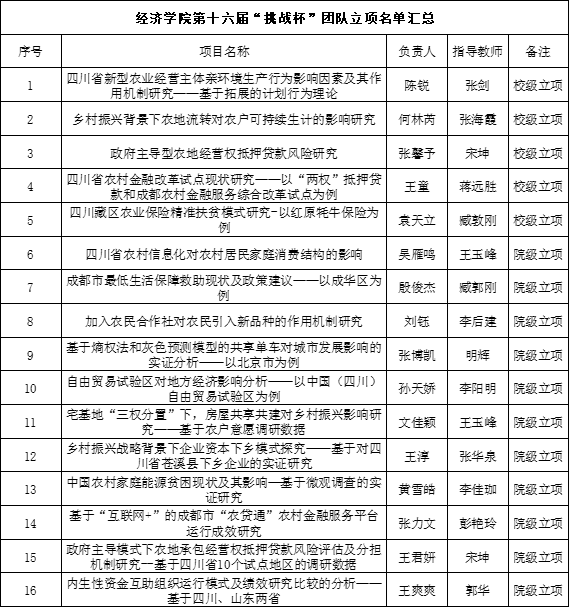根据校团字〔2018〕13号《关于举办第十六届“挑战杯”全国大学生课外学术科技作品竞赛校内预选赛的通知》,经学生申请、答辩,学院教师团队评审,产生太阳集团tyc9728第十六届“挑战杯”立项团队汇总名单,现予以公示。公式时间:2019年3月30日—4月3日,公式期间如有异议,请联系太阳集团tyc9728团委办公室:028-86291370。