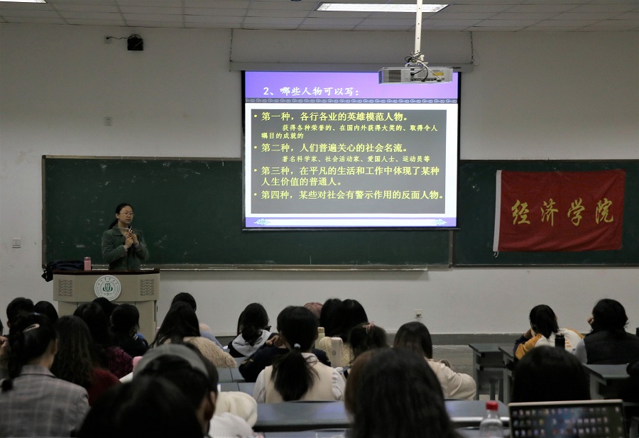 杨雯老师主要为大家进行人物类通讯稿专题培训。她首先指明了通讯的定义,介绍了通讯的分类,并着重就人物通讯进行讲解。她指出,人物通讯写作要注重典型意义、故事性和思想性三大要素,并结合校网上相应例子,从老师、同学等不同人物角度,逐一深入浅出地为大家进行阐述和说明。她还强调,撰写人物通讯,在突出故事性的同时,切忌将通讯写成人物工作总结、写成流水账或概述太多。最后,杨雯老师还就撰写时关于人称、小标题、提取主题、采访和突出人物性格等注意点进行了提醒和说明。