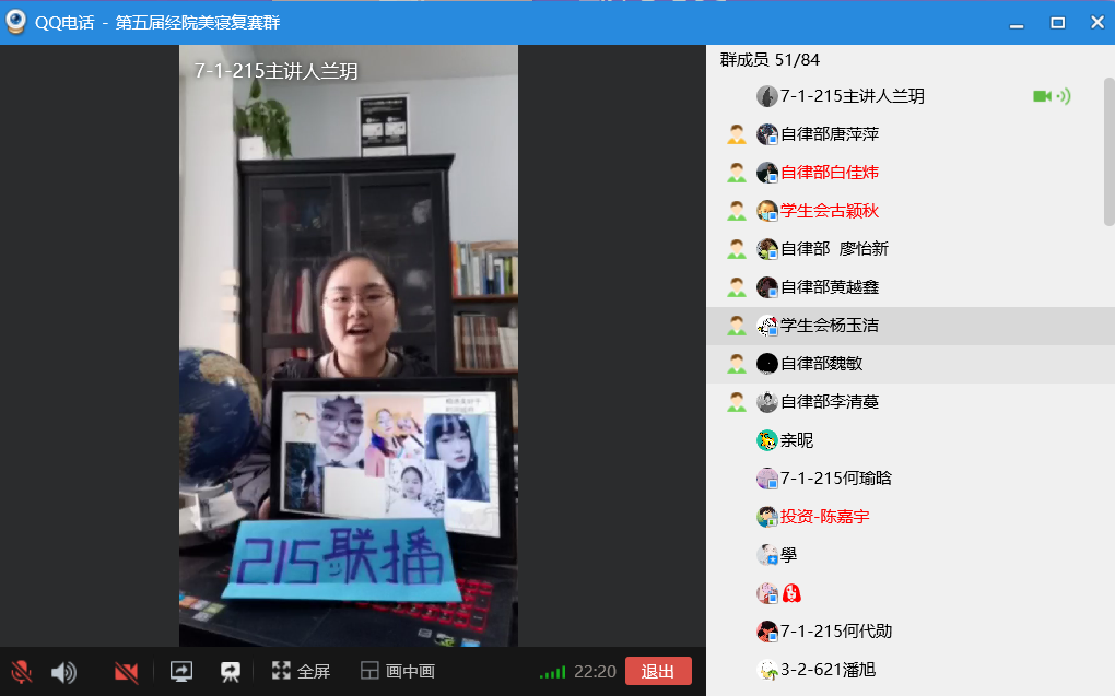 2020年2月23日下午,由太阳集团tyc9728学生会自律部主办的“寓美于寝,笃学于室”第五届美寝大赛决赛顺利举行。此次活动虽受疫情影响首创以网络直播形式举行,但隔屏不隔爱,活动受到了老师、同学们的热烈反响。莅临本次活动的嘉宾有学院党委办公室徐秋梅老师、太阳集团tyc9728主席团成员、资源学院自律部部长杨文怡、环境学院自律部部长闵昊等。