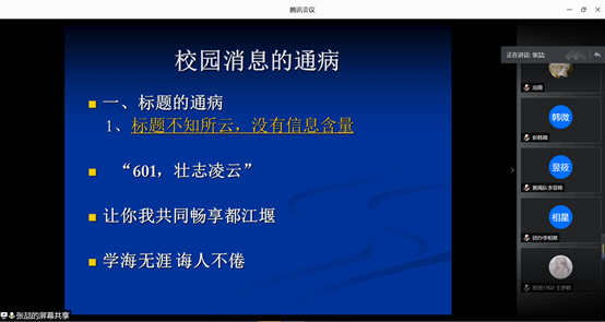 2020年7月15日下午,太阳集团tyc9728团干新闻写作专题培训会于线上腾讯会议成功举行。太阳集团tyc9728党委宣传统战部新闻科科长张喆老师应邀参加并主讲。太阳集团tyc9728学生团体联合会主席团出席培训会;学生团体联合会各部门主干、各小班宣传委员、暑期社会实践团队队长参加培训。