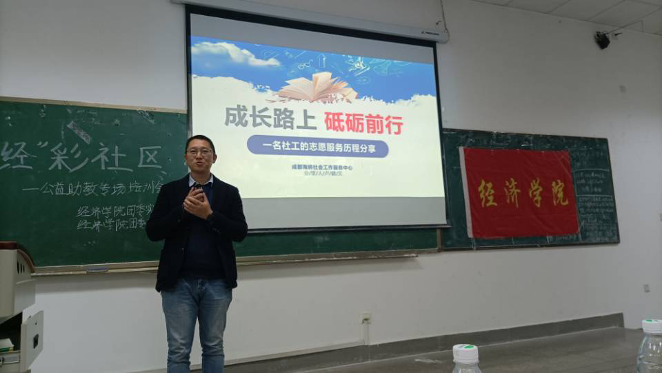 四川省第一届蓉城最美社工之一的卢健文分享了自己学生时代参加志愿服务的收获。他以“成长路上 砥砺前行”为题,向大家讲述了从大学四年社工服务到现在社会工作学士、中级社工师一路走来的经历。他鼓励大家主动寻找更多的机会,不局限于学院已提供的社会实践活动,要敢于尝试创新。一名参会同学这样感慨:“卢先生是彝族人,可能志愿服务的机会相对少一点,但他没有气馁,而是选择积极寻找机会,一直坚持了八年,我很佩服。”