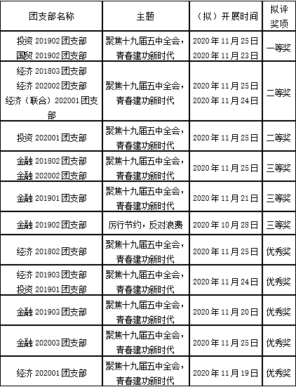 注:团日活动未开展支部为拟评选,须在11月25日之前将活动开展完,开展期间学院将成立评定小组现场监督考评。考评结果为“特别优秀”的支部,可提升获奖等级,“优秀”的支部,保留原获奖等级并颁发全额奖金,“良好”的支部保留原获奖等级并颁发80%的奖金,“合格”的支部保留原获奖等级并颁发60%的奖金,“不合格”的支部撤销奖项。(考评分数>95为“特别优秀”,80-95为“优秀”,70-80为“良好”,60-70为“合格”,低于60为“不合格”)