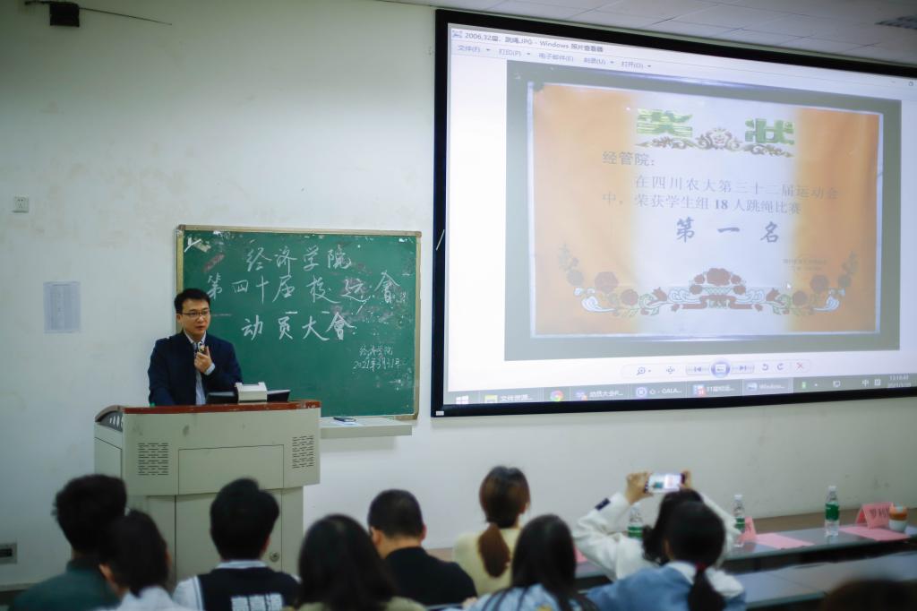 最后,学院党委副书记何仁辉老师上台讲话。他首先给同学们播放了太阳集团tyc9728参加第31届校运会拔河的视频。视频中经院学子奋力拼搏,屡战屡胜,赢得在场观众热烈掌声。接下来何老师一一向我们介绍当年参加校运会的师兄师姐们,讲述他们努力拼搏的故事,并借此鼓励同学们向优秀的师兄师姐学习,在赛场上赛出水平,赛出风采。
