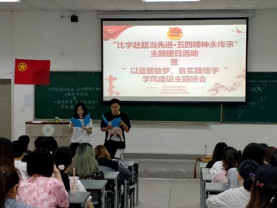 为纪念五四运动,提升本班同学对于五四精神时代意义的理解,以自身行动传承五四精神,营造“比学习,当先进,争一流”的班级学风,经济三个团支部联合开展“比学赶超当先进,五四精神永传承”主题团日活动暨“以蓝图绘梦,自实践悟学”学风建设主题班会。本次团日活动由韩浩博同学与张启越同学共同主持。