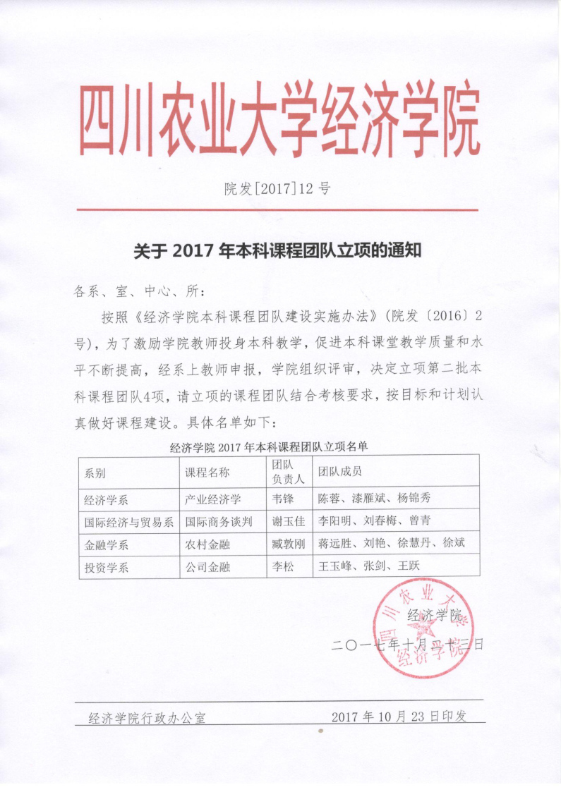 院发【2017】12号 关于2017年本科课程团队立项的通知