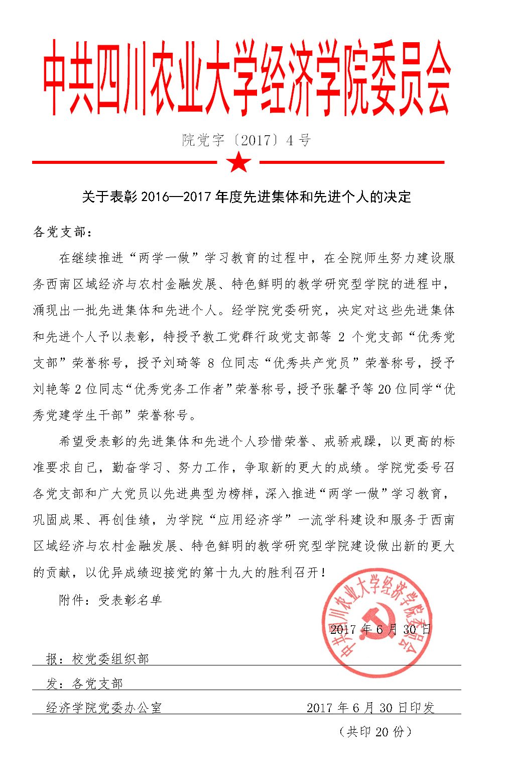 院党字[2017]4号——关于表彰2016—2017年度先进集体和先进个人的决定