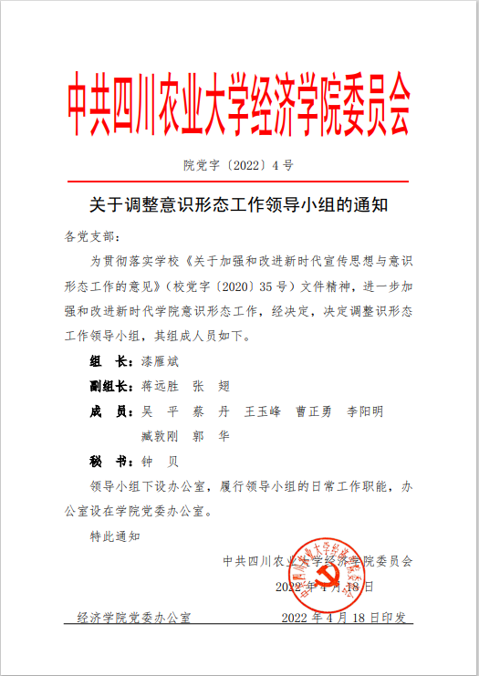 院党字〔2022〕4号——关于调整意识形态工作领导小组的通知