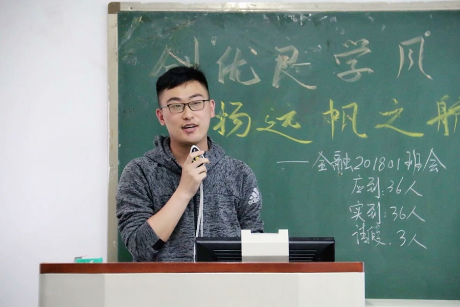 大学开学之初,金融201801班召开进校以来第一次班会。马俊龙老师在班会上做了简单的自我介绍后指出:现在,一个新的班级组建了。正如一个人的成长一样,一个新生的班级,需要建设、需要发展、需要进步,这要求我们班、我们班的每一位同学,都要能够有所展望,有自己的目标,不断努力,把班级每一位同学的力量,汇聚成整个班级建设的合力。马俊龙老师的讲话高屋建瓴、深入浅出,展现一位班主任所应肩负的担当,极大地鼓舞了同学们,让同学们对大学生活充满自信和憧憬。