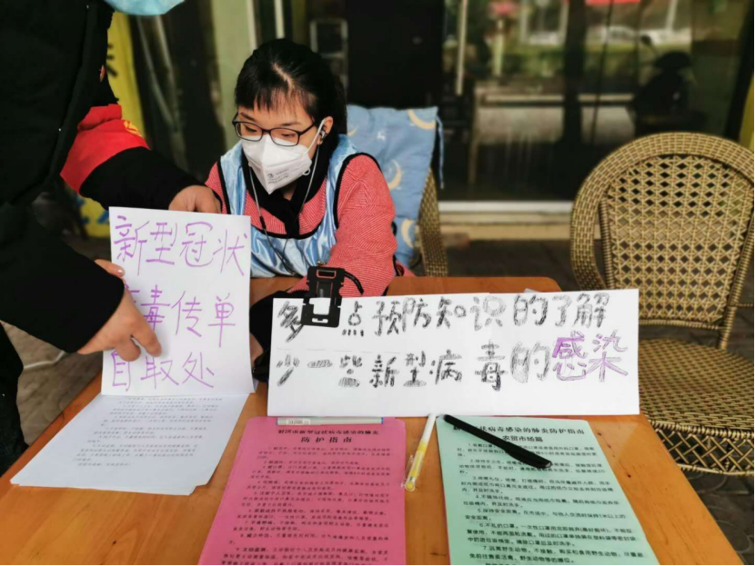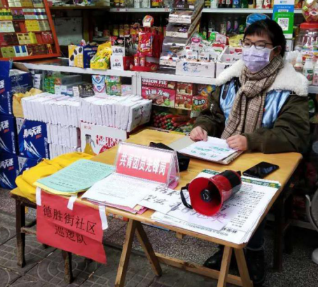 2020年2月4日早上7点,冬日的清晨还笼罩在黑暗之中,谢学奥却已开始了她一天的防疫工作。街道上张贴的防疫传单,喇叭中不停播放着的防疫公告,“动人心者,莫贵乎于行”,从广场到菜市场再到居民住户区,疫情期间人人避之不及的人员聚集地,却都是她忙碌的身影。