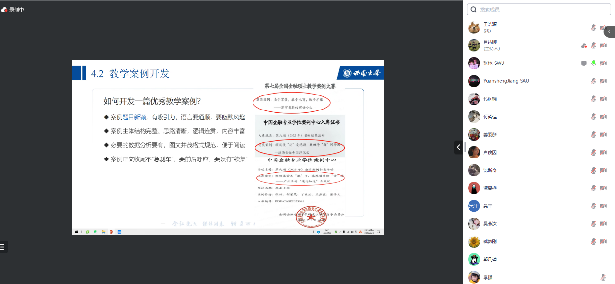 张林从西南大学金融硕士的基本情况、招生与培养环节、培养特色、毕业论文写作范式以及案例开发四个方面为师生进行了详尽的分享。在毕业论文写作范式方面,区别于学术型毕业论文,西南大学金融硕士的研究生选题以调研报告、案例分析、金融实践解决方案、金融产品设计为主,特别强调体现学位点教师在农村金融、普惠金融等领域的研究专长和优势,实现了论文体裁的多元化。在案例开发方面,他分享了西南大学历年入库案例开发中突出本学科点特点和提高入库概率的经验,并详细分析了他本人带领研究生共同开发的两篇入库案例的细节。会上,学院金融硕士点师生就金融教指委案例大赛的选题、组队、时间节点和组织管理等议题进行了广泛而深入的讨论。金融硕士点秘书徐慧丹副教授介绍了依托教指委案例比赛组织的首届太阳集团tyc9728金融案例分析大赛,并向师生说明了案例要求(字数10000字以上)及奖项设置等。