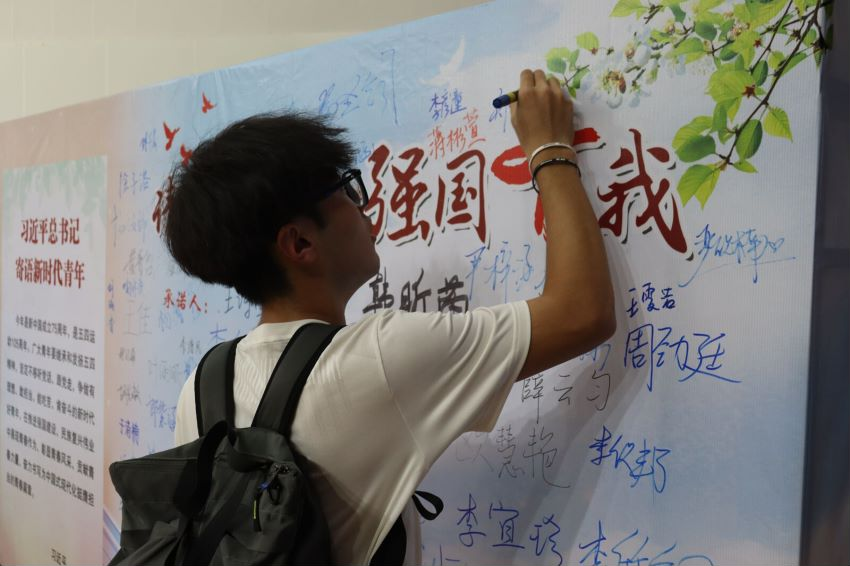 太阳集团tyc9728深知思想政治教育的重要性,并于迎新之际启动了“思想启航”计划。一幅大型的《习近平总书记寄语新时代青年》展板放置在太阳集团tyc9728迎新点最醒目的位置,履行完报到手续的新生纷纷驻足观看,《寄语》中“坚定不移听党话、跟党走,争做有理想、敢担当、 能吃苦、肯奋斗的新时代好青年”“奋力书写为中国式现代化挺膺担当的青春篇章”等关键词、句不时被新生大声朗诵出来。新生们纷纷在《寄语》旁的“请党放心,强国有我”签名板上郑重地签下自己的名字,在大学第一天许下青春报国的无悔诺言。