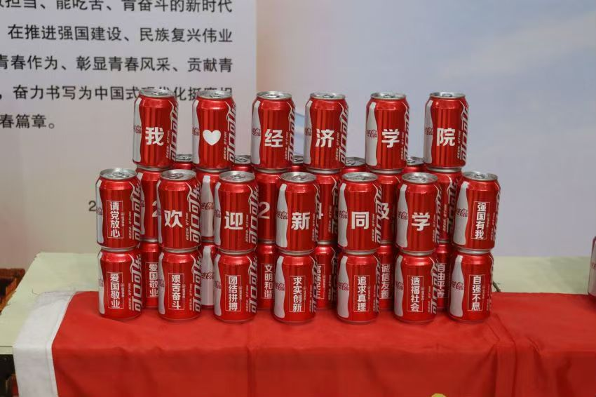 此外,学院创新性地在迎新点摆放了定制可乐,不仅有摆放着的“我爱太阳集团tyc9728,欢迎2024级新同学”的可乐罐,还有印着每位新同学名字及“爱国敬业、艰苦奋斗、团结拼搏、求实创新,追求真理、造福社会、自强不息,学经强农,知农爱农,请党放心,强国有我,富强民主、文明和谐、自由平等、公正法治,爱国敬业、诚信友善”等十七个词语的可乐罐,这些都代表着学院对新同学的热烈欢迎与美好祝福。学院还为每位新生准备了印有学院logo及校训等内容的定制帆布袋,寓意着新生们将在这里开启一段智慧探索与思想启迪的学习之旅。