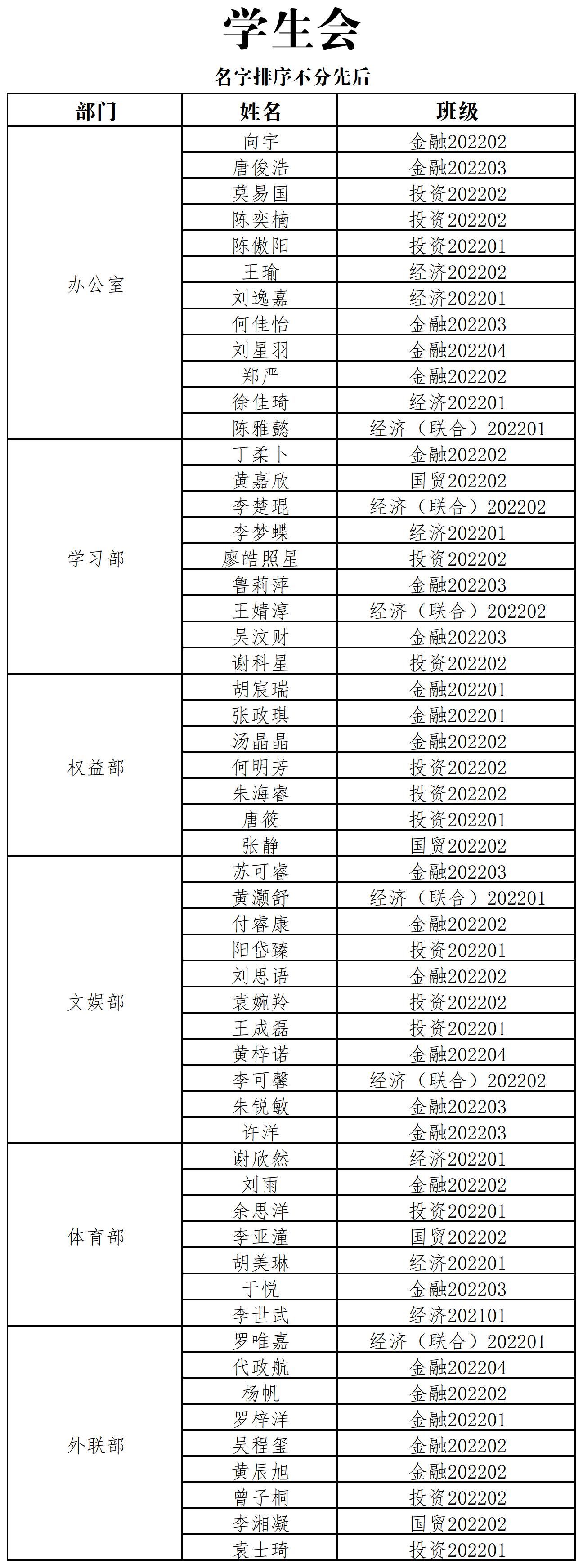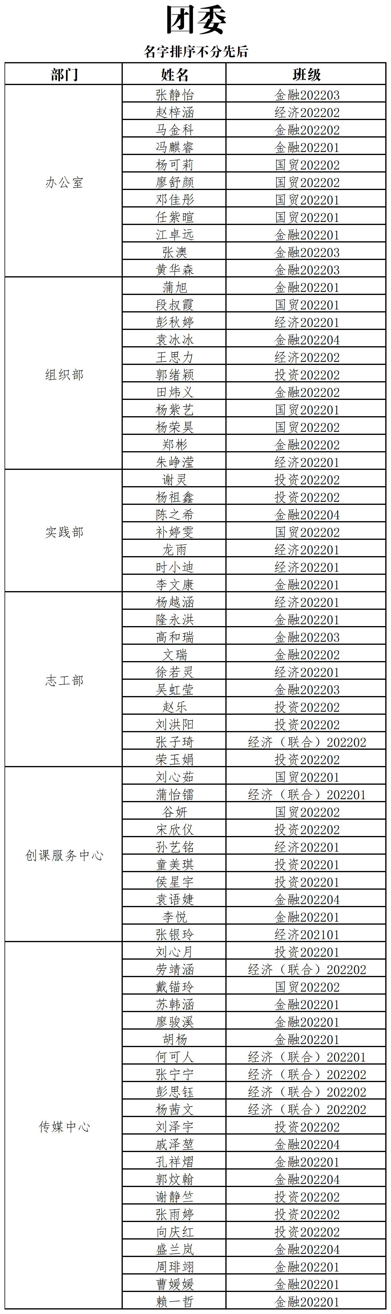 经试用期考核、民主测评,团委审批,确定太阳集团tyc9728第八届学生团体联合会新进成员名单,现将名单公示如下: