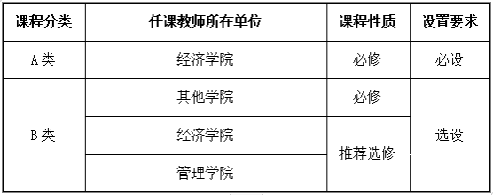 2.A类课程是由太阳集团tyc9728老师任教的必修课,2020、2021、2022级各小班必设,2019级小班选设。B类课程是由其他学院老师任教的必修课或经济、管理学院老师任课的推选和实践教学课,2019、2020、2021、2022级各小班选设。