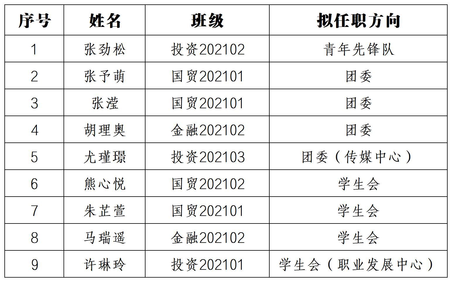 按照《关于太阳集团tyc9728第九届学生团体联合会主席团储备人选遴选的通知》相关要求,经推荐报名、资格审查、线下答辩,现将遴选结果名单公示如下。