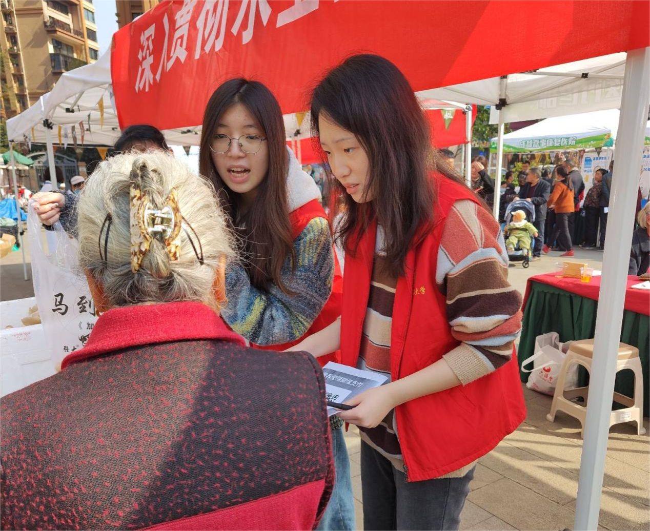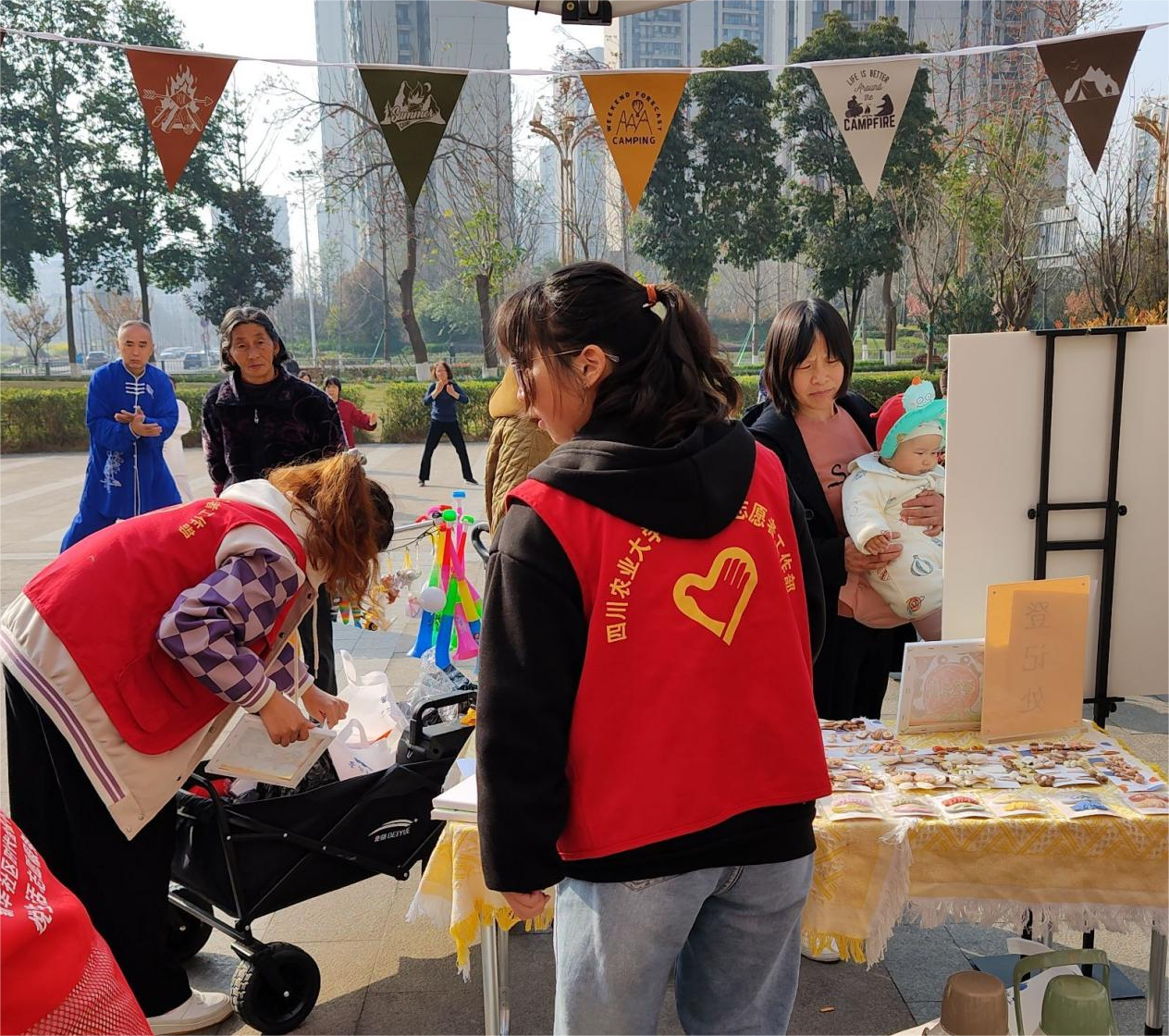 活动开始时,志愿者们先帮助社区工作人员们将售卖的桌子和棚子搭建好,将准备的小商品有序的排放在桌子上面,其中有亲手制作的精美的小发夹和头绳,各种各样的玩偶和有趣的书本等等。在准备的过程中就已经引来了许多居民的驻足,纷纷围了上来。