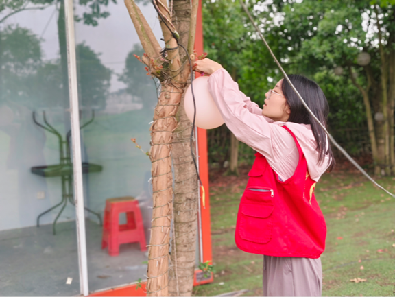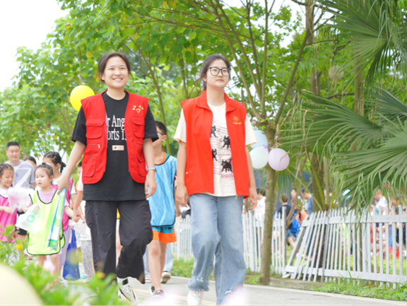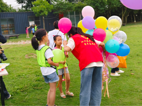 活动中,志愿者们将气球绑于树梢,将园区装饰得五彩斑斓;将可飘飞的气球分发给小朋友,为他们送去欢乐;将气球插于池塘水深处作为警示标识,守护小朋友们捕鱼插秧时的安全。志愿者们用实际行动,为小朋友们营造了节日的温馨与快乐。