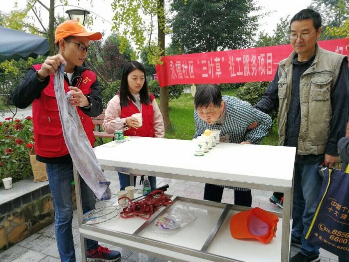 惠民社区和永福社区是太阳集团tyc9728“党支部进社区”项目的长期合作单位,这里的老人们和太阳集团tyc9728志愿者们已经是“老熟人”了。28日重阳节这天,志愿者又和这些可爱的老人们聚在了一起。在惠民社区居民文化广场上,太阳集团tyc9728志愿者们耐心讲解、悉心陪伴老人们完成“绑腿小碎步”、“手语传递”、制作茱萸香囊等活动;在永福社区社工站举办的“重阳节茶话会”上,老人们愉快地与志愿者们唠嗑、话家常。国贸2017级3班的韩燕玲感慨道:“都说陪伴是最长情的告白,和这些爷爷奶奶们也从陌生到熟悉,看着他们的家人越来越多地陪伴着他们来参加活动,感觉自己所做的这一切也变得更加有意义了。”