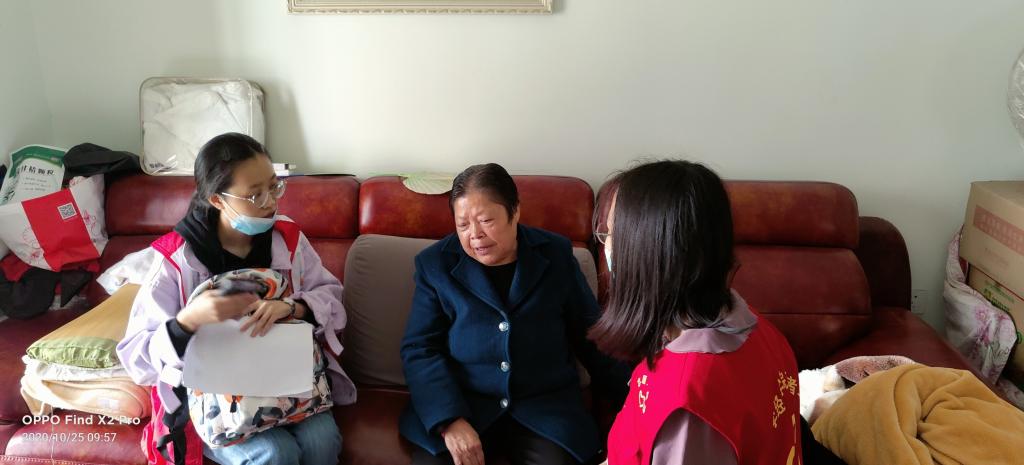 这一天是重阳节,一路上,新加入的志愿者怀揣着小小的激动与期待,这对于他们来说,是一段特殊的经历。轻轻敲门,没有回应,鼓起勇气,再敲一次,还是没有人,有点失望。随着一声“谁啊……”传来的还有开门的脚步声…志愿者们与奶奶交谈着,慢慢打开了奶奶的心扉,聆听着奶奶的诉说,安慰着曾经受过一些伤害的奶奶。这些老人的儿女大都不在身边,他们缺少陪伴,缺少爱。志愿者同时也送出了一些小礼物与写着美好祝福的贺卡,希望老人身体健康,忘掉不开心。