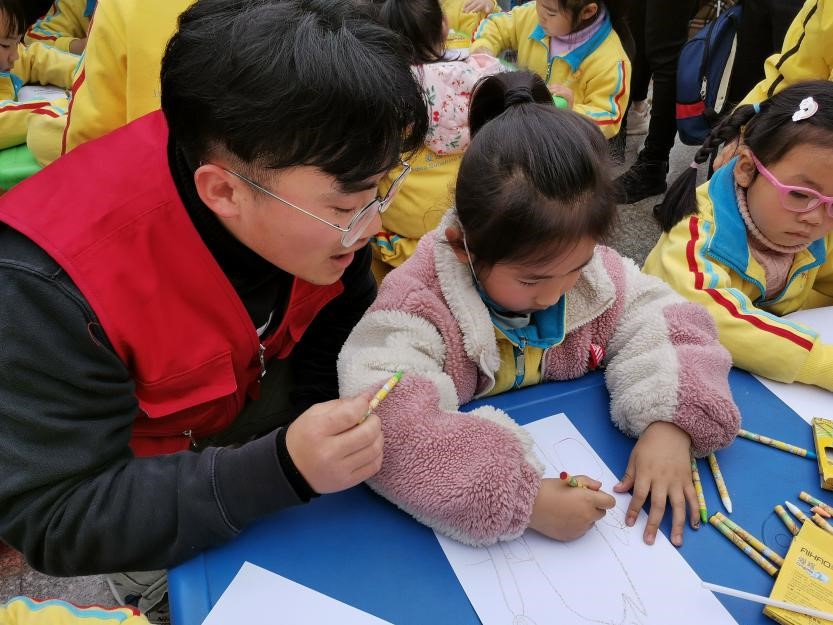 活动的高潮——“美丽中国”绘画环节,由每个大学生志愿者引导一位小朋友绘画。每位小朋友用彩笔在纸上画出自己最喜欢的树,并且讲述自己的画和画里的故事。大学生们引导小朋友大胆想象画出自己心目中的大树和树下的故事,同时也在小朋友心中播种了爱护绿色保护环境意识的种子。
