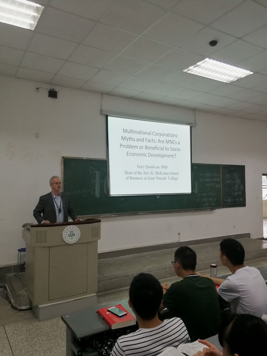 After the meeting, Dr. Quinlivan gave an academic report entitled “Multinational Corporations: Myths and Facts” to our teachers and students. Dr. Quinlivan analyzed the advantages and disadvantages of multinational corporations on social and economic development from the perspectives of multinational corporations and seeking monopoly power, multinational corporations and the world environment, foreign debt problems of multinational corporations and developing countries, and poverty and poverty. After the lecture, the students present questioned and interacted with the development of the world economy, the Sino-US trade war, and the influence of multinational corporations on developing countries.