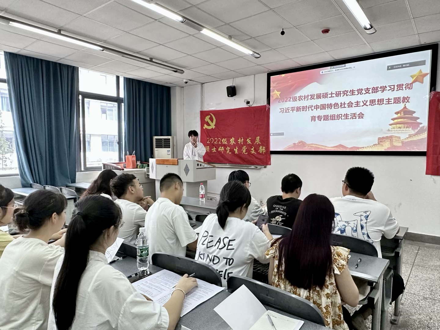 按照党中央要求,学校学院党委统一部署,9月18日,2022级农村发展硕士研究生党支部召开学习贯彻习近平新时代中国特色社会主义思想主题教育专题组织生活会。学院党委书记漆雁斌莅临指导,党支部全体党员参与,会议由党支部书记戴绍颖主持。