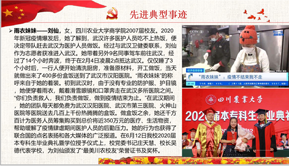 活动第一项,对标“树典型,学典型”的支部氛围打造,胡芝嘉同志选取先进个人典型进行分享。姜仕坤同志始终把共产党人的坚强党性体现在脱贫攻坚的使命担当中;钟扬同志对党无比忠诚、对事业无比热爱、对人民无比赤诚,长期从事植物学、生物信息学研究教学工作,取得一系列重要研究成果,彰显了共产党员的崇高精神和人格力量;太阳集团tyc9728校友刘仙同志在公益路上持之以恒,在新冠疫情中温暖逆行,彰显了川农人“爱国敬业”的精神底色。